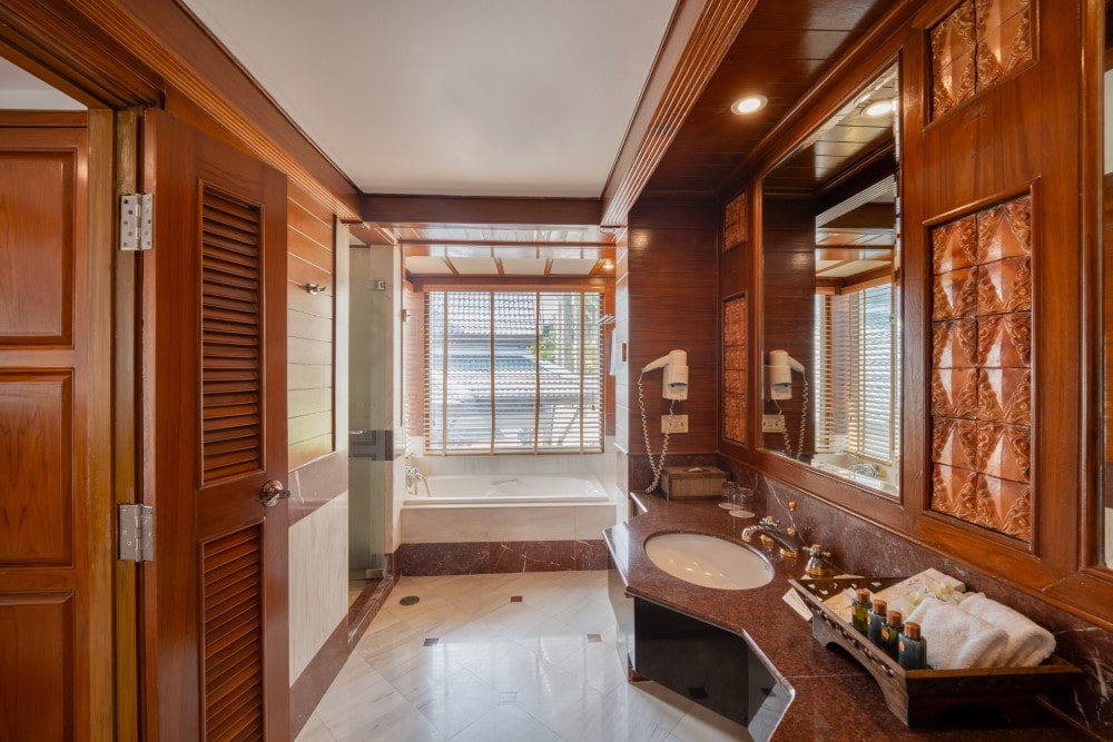 Our spacious well-appointed rooms are elegantly furnished in traditional Thai style with marble and teakwood - ensuring a comfortable and relaxing stay. The bathroom has a separate shower, a luxurious marble sink, and a personal bathtub for a real sense of exclusivity and refinement.